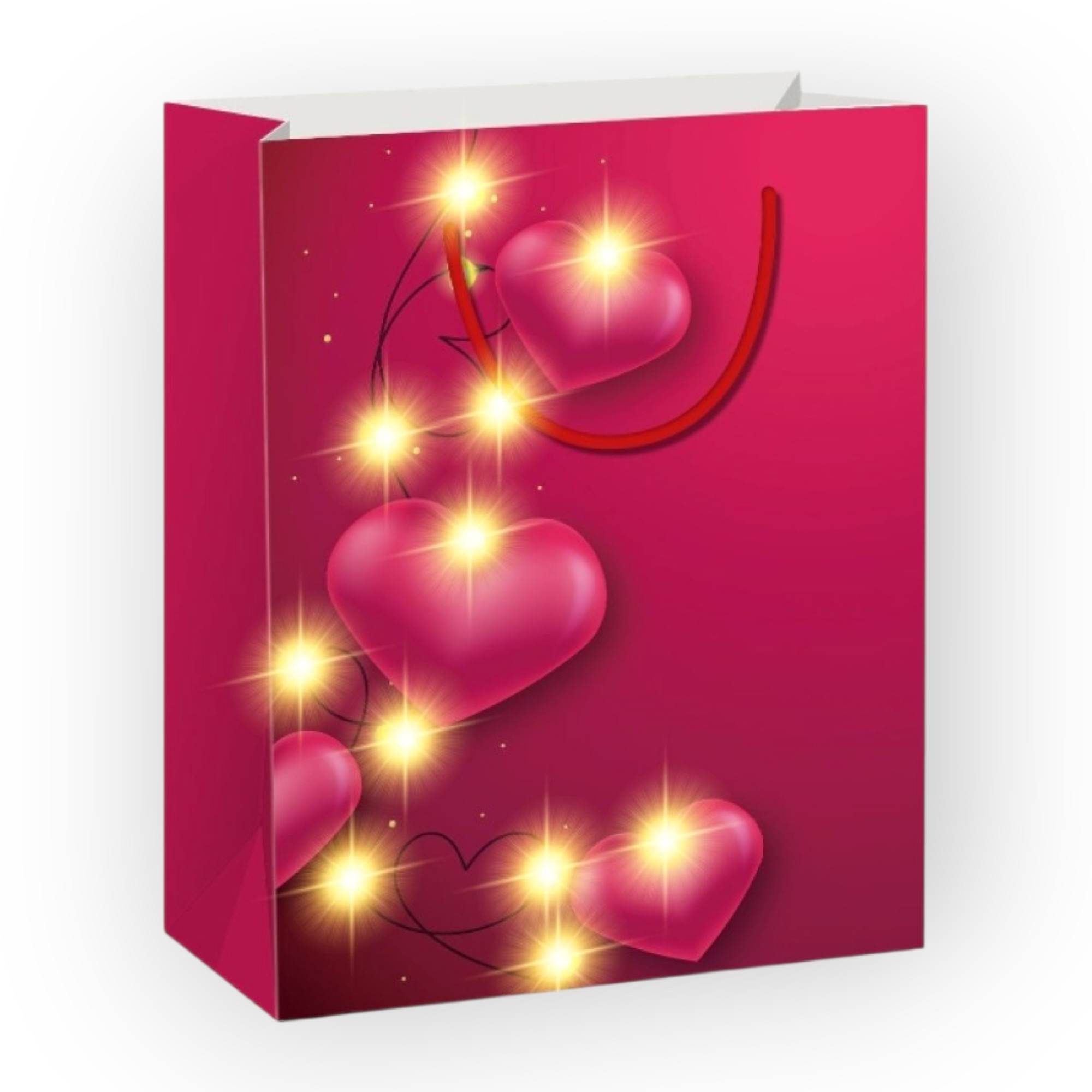 Romantikus hanulatú, szív mintás ajándék tasak  LED viláítással. Méret: 265 x 127 x 330 mm