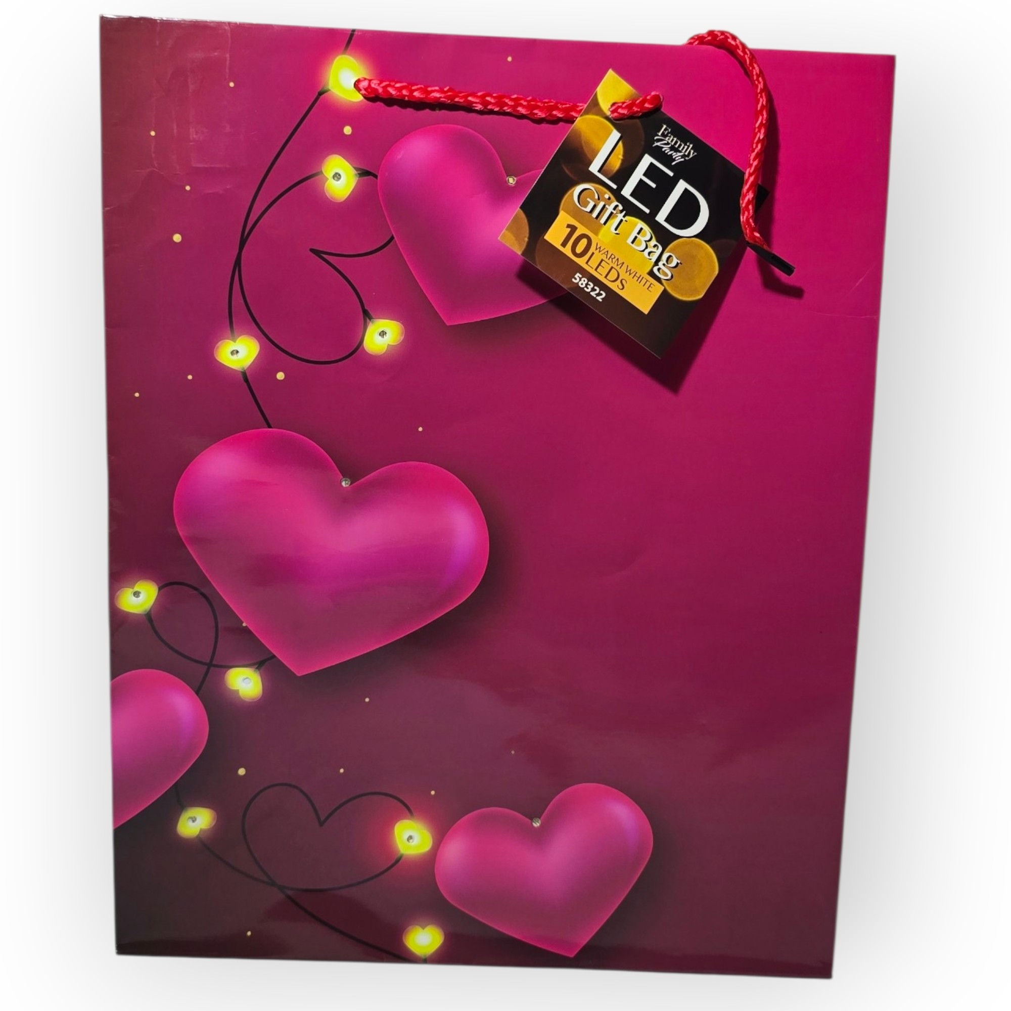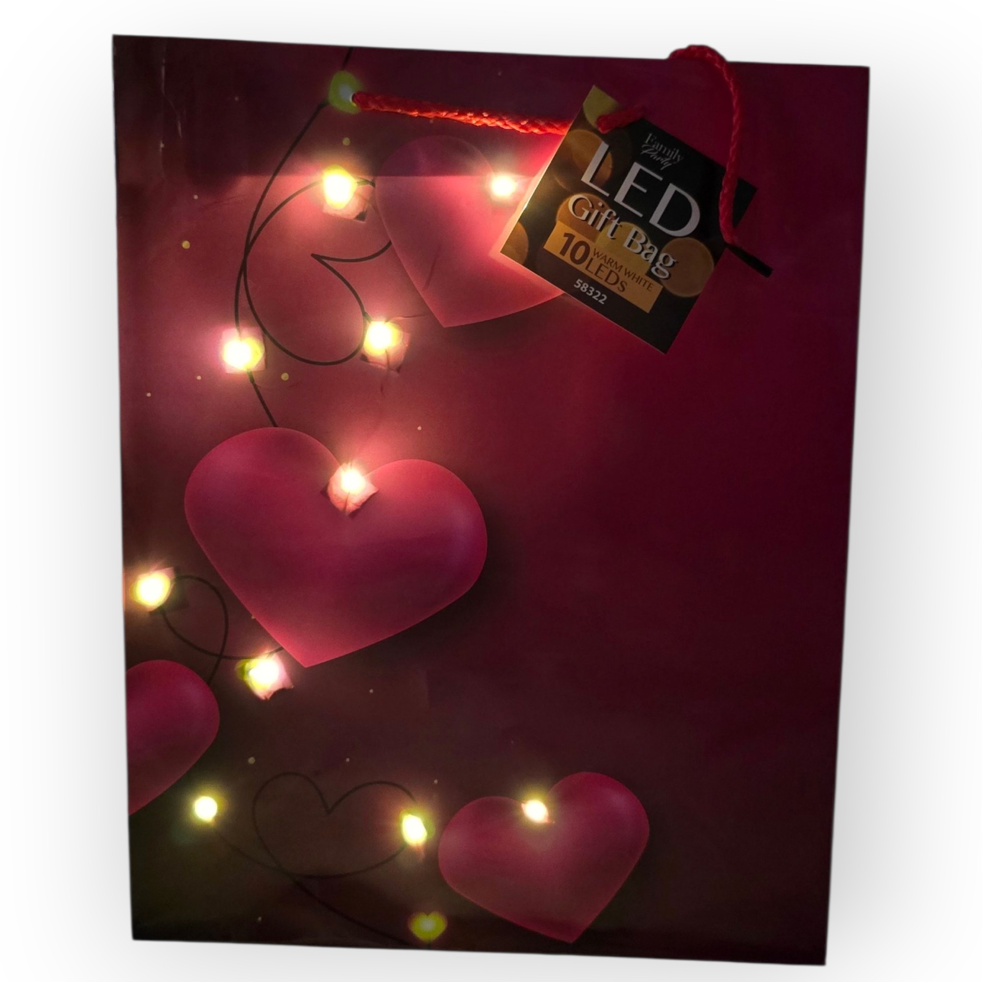 Romantikus hanulatú, szív mintás ajándék tasak  LED viláítással.