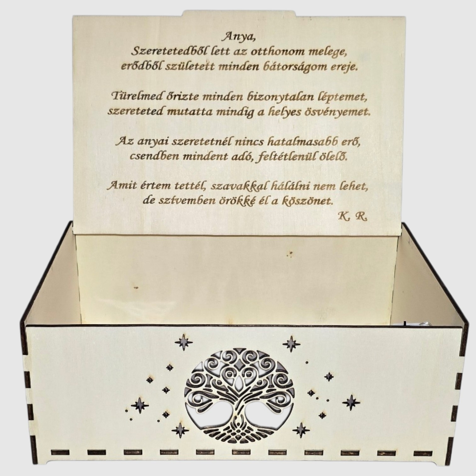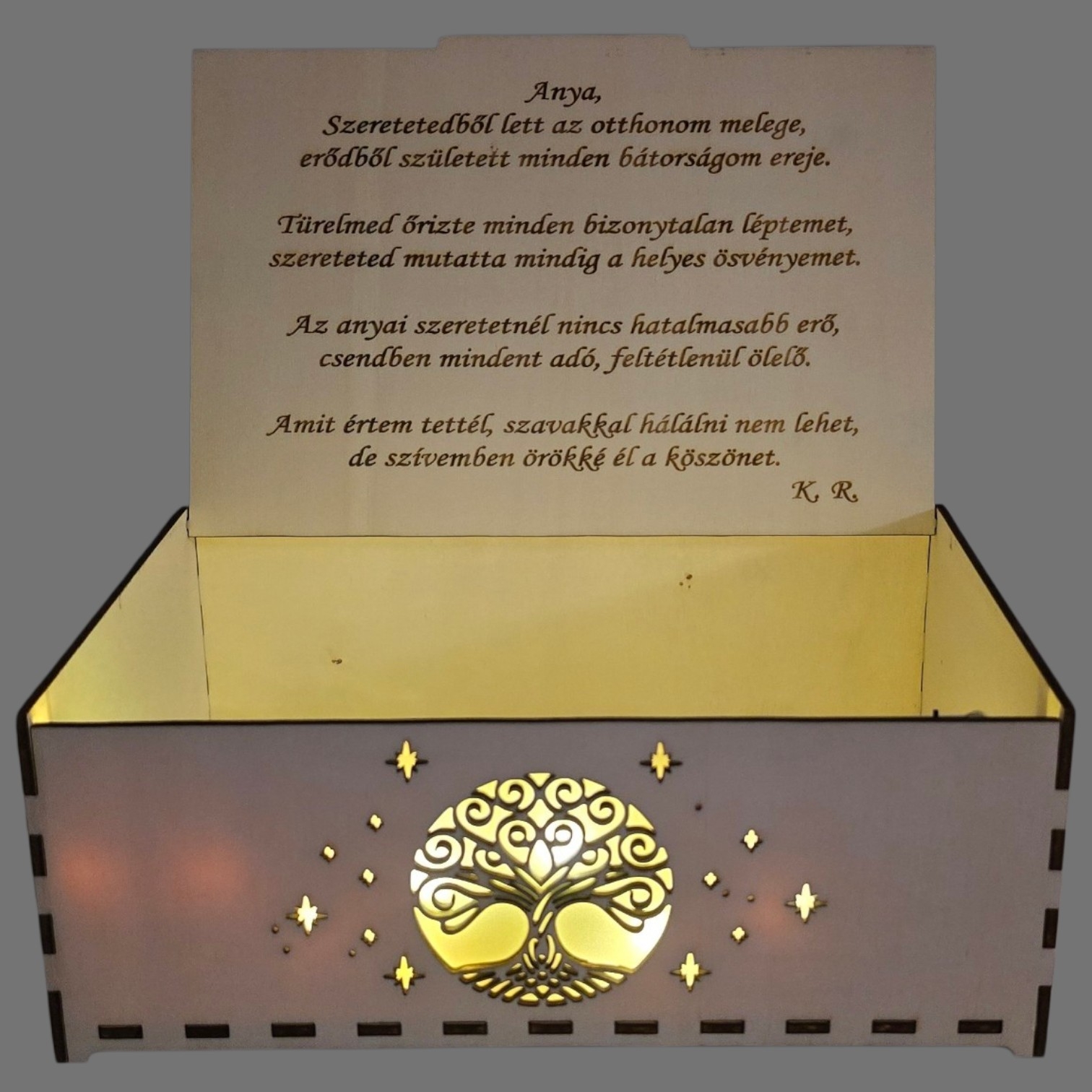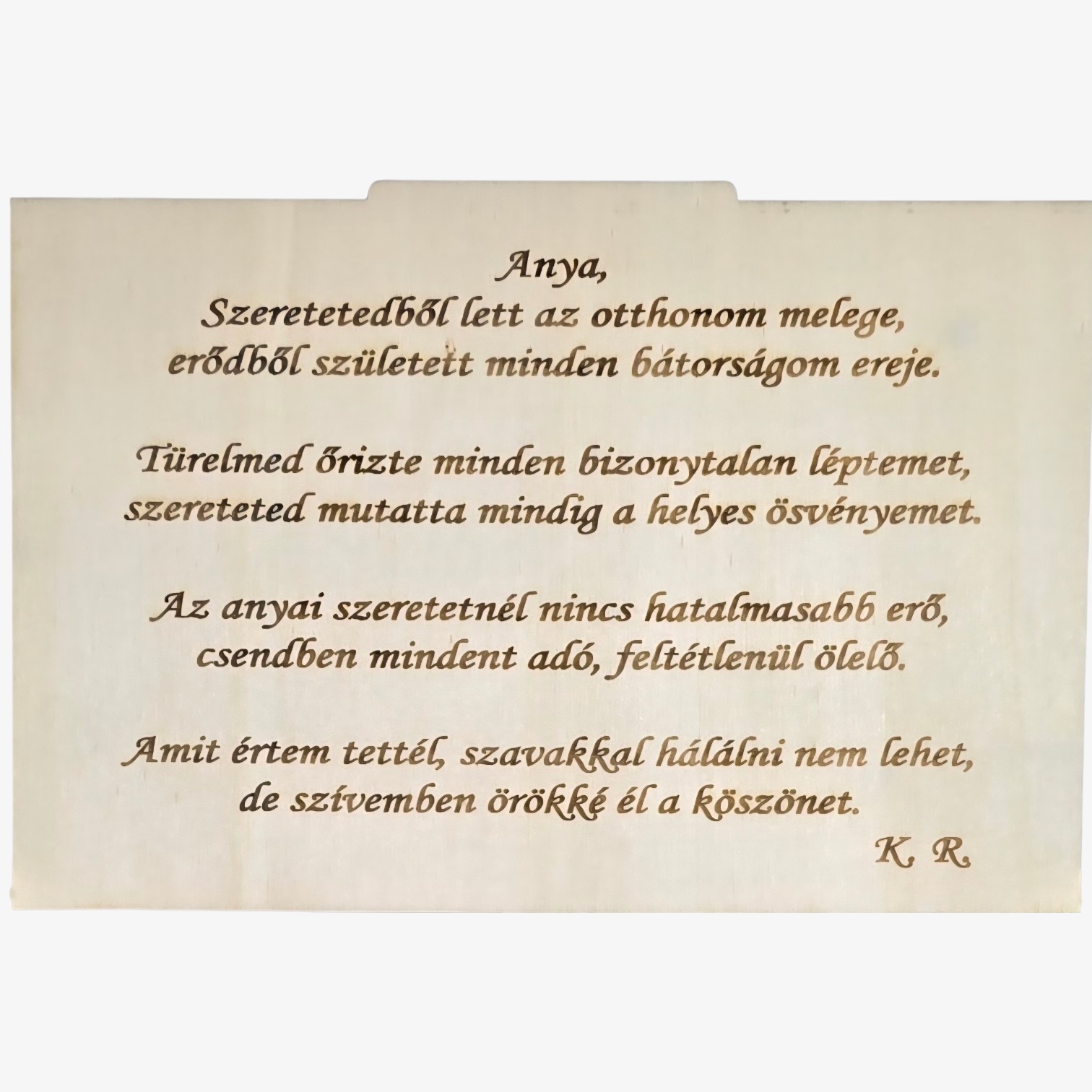 A doboz belsejében egy gravírozott, szívből szóló üzenet található – egy vers, amely az anyai szeretet erejét, türelmét és mindent felülmúló értékét fejezi ki.